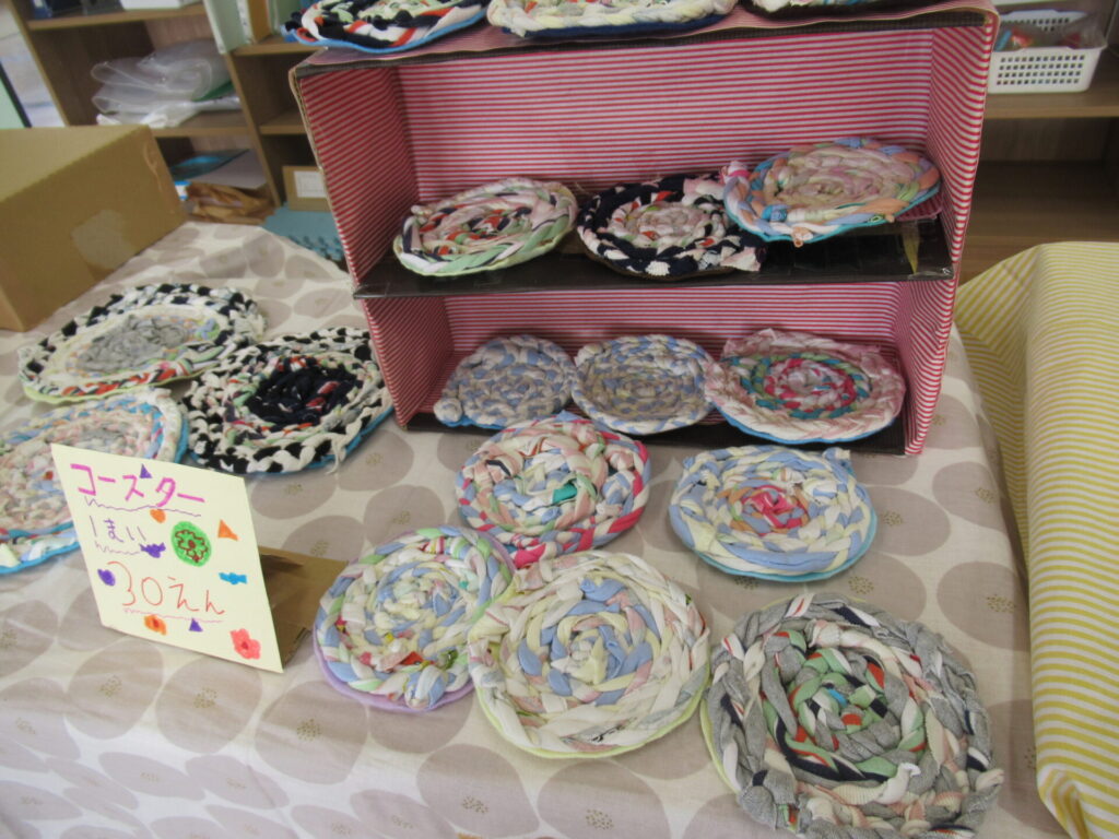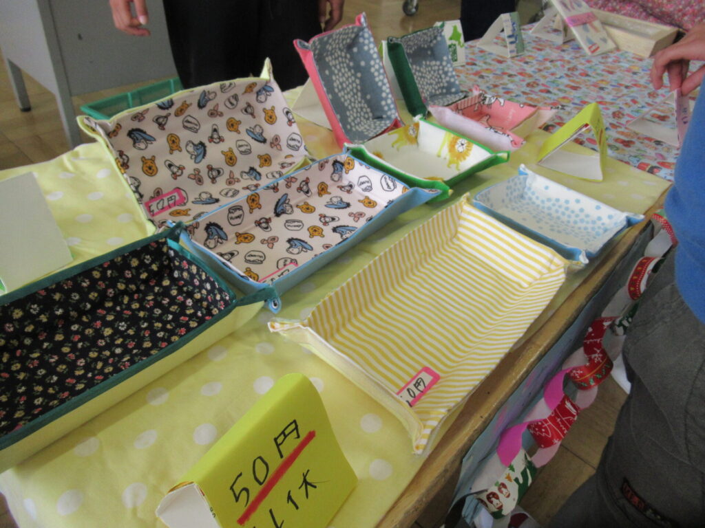 春はじゃがいも販売、夏はカレーレストランと、今年度2回のお店やさん活動を通した学習を行っているくすのき学級では、次なるお店の準備に励んでいます。今回は、総合的な学習の一環として、SDGsを意識した「エコグッズ」の販売を予定しています。牛乳パックや空き瓶、古着などの不用品を、手作り雑貨にしました。販売は、全校児童の保護者の皆様に向けて、12月に行う予定です。お楽しみに!
