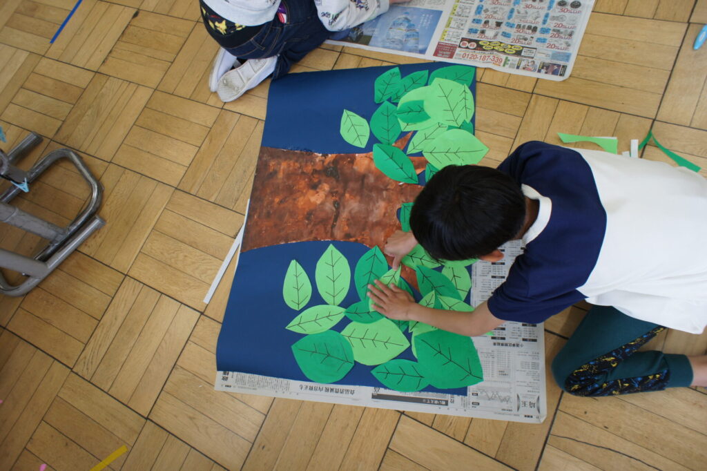 今年度の学級目標は、「くすのき」の頭文字からできた合言葉になっています。苦しい時も、素直さがあれば、それぞれの力を最大限に伸ばしていける。そんな姿勢を大切にして欲しいと思い、決めました。校庭のシンボルツリーであるくすのきをイメージして、太くたくましい幹は、スポンジに絵具をつけて色付けしました。注意深く台紙に貼ったら次は葉です。折り紙を何枚も切り、ペンで葉脈を描きました。最後に、クラスみんなの似顔絵を貼ったら完成!1年間、教室を明るくしてくれそうな、掲示物ができました。