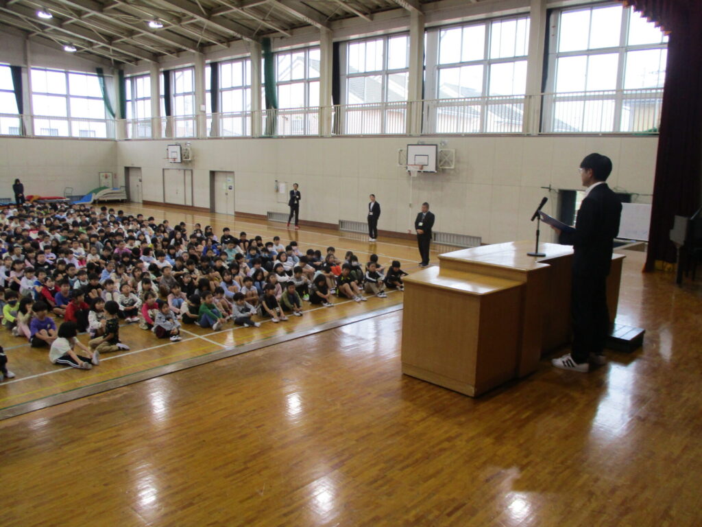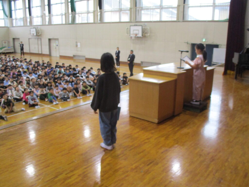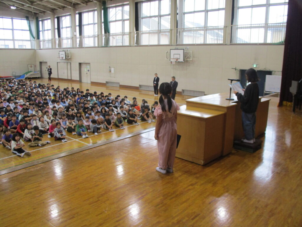 10月16日(木)、敬老コンクールと科学展の表彰が行われ、その後、前期終業式がありました。はじめに、2年生と4年生の代表児童が、「前期を振り返って」という内容で作文を発表してくれました。前期に自分が頑張れたことや後期の目標など、それぞれ堂々と発表ができて素晴らしかったです。校長先生の話では、校訓「かしこく、やさしく、たくましく」が学校生活の中で実践できたか等を中心に、前期の頑張りを振り返り、また通知票や秋休みの安全などについて話がありました。終業式の後は、それぞれの学級で、前期の成長を称えたり、お楽しみ会をしたりするなどして過ごしたようです。