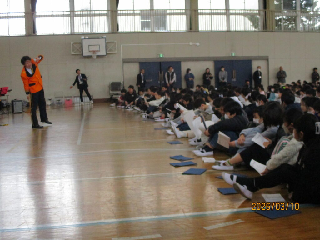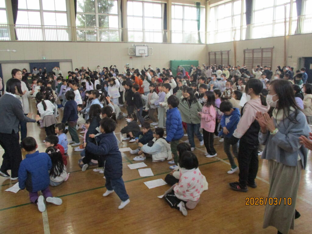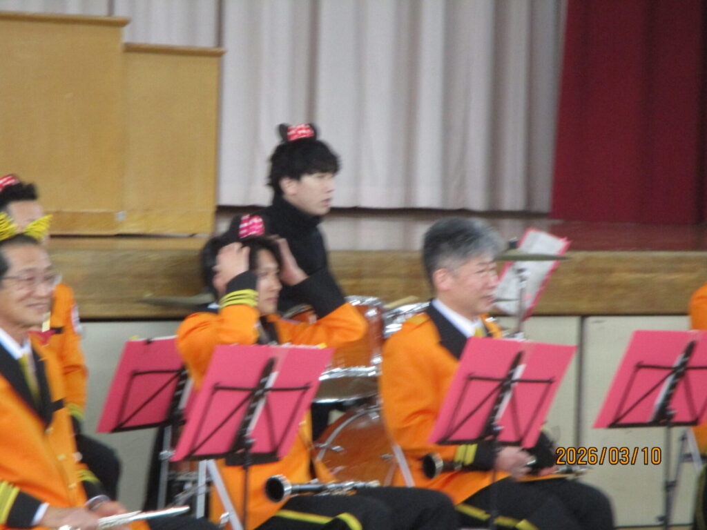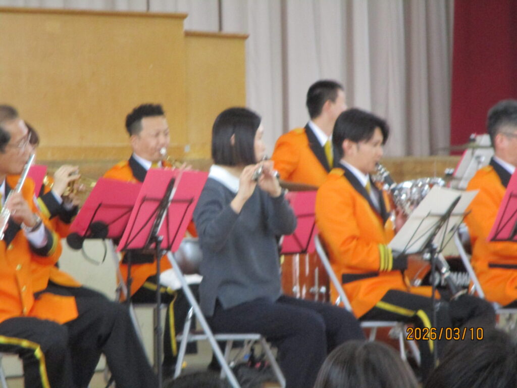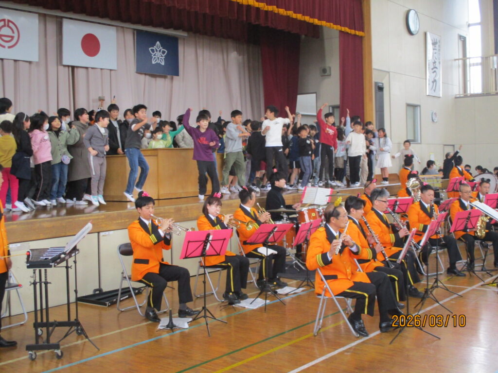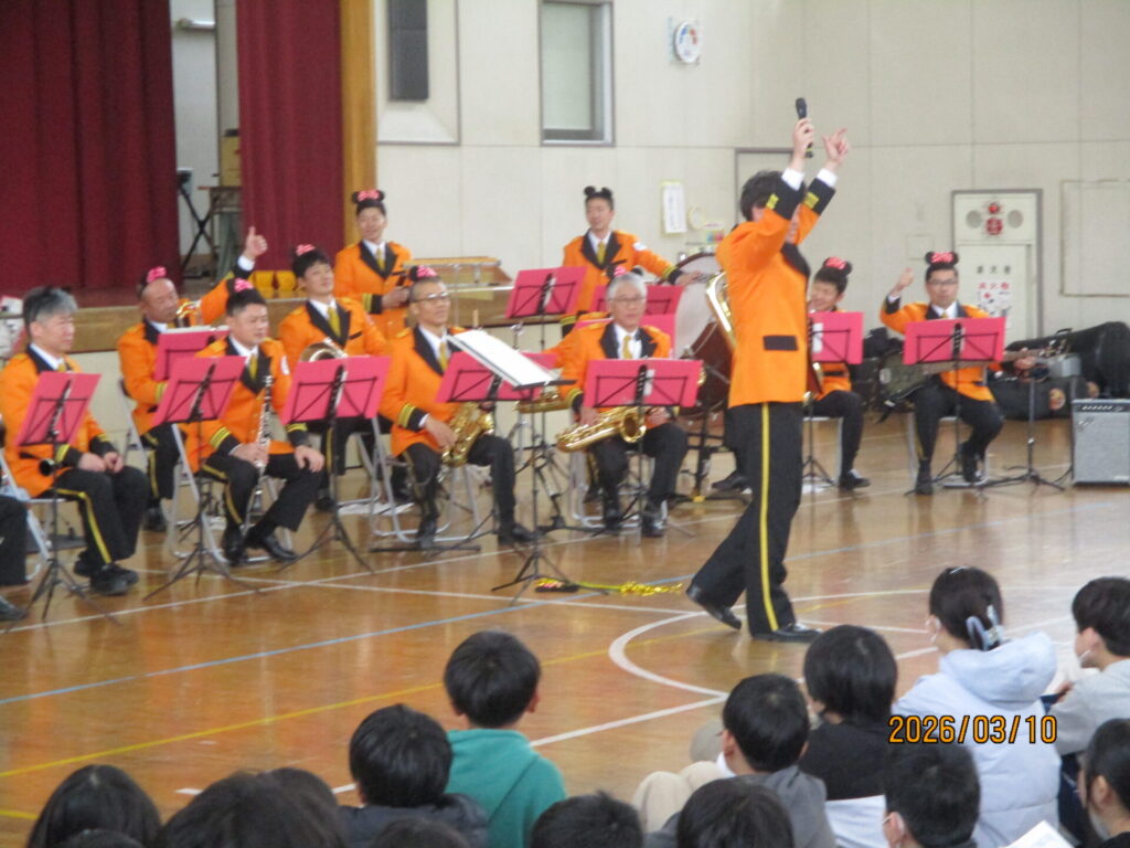 3月10日(火)3校時、熊谷市消防音楽隊による卒業記念コンサートがありました。宇宙戦艦ヤマトや銀河鉄道999の主題歌など大人が喜ぶ曲から、子どももよく知っている名探偵コナンのテーマ曲、みんなで盛り上がれるultra soulなどたくさんの曲を演奏してくれました。スペシャルゲストで先生がフルートやドラムで演奏に参加する一幕もありました。最後のアンコールのジャンボリミッキーでは、みんなで踊って大盛り上がりでした。6年生の大切な思い出の一つになりました。熊谷市消防音楽隊のみなさん、ありがとうございました。