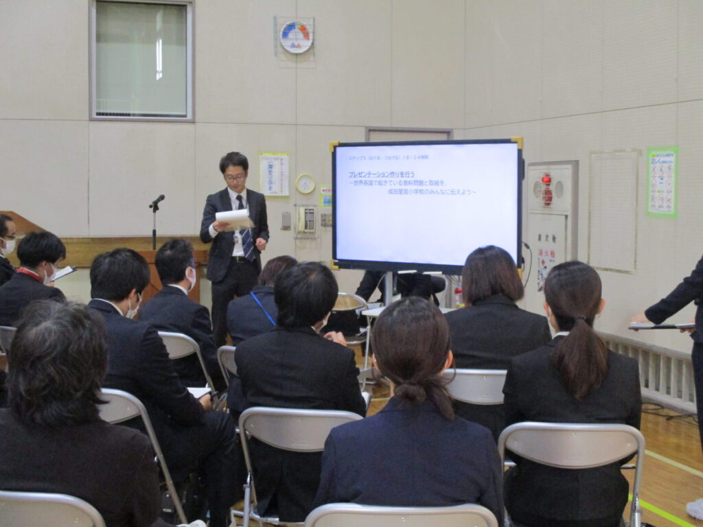 11月7日(金)、市委嘱の学習指導研究発表会がありました。くすのき学級は「お店屋さんを開こう!」という生活単元の授業を公開しました。3年生以上の授業をすることになった学級は、総合的な学習の時間の授業を公開しました。内容は伝統、環境問題、食料問題、防災です。来校した他校のたくさんの先生方に、成田星宮小の子どもたちの、友達と話し合ったり、みんなの前で発表したりする一生懸命な姿を見せることができました。児童下校後は全体会があり、学校として研究した内容や成果の発表をしました。成田星宮小の授業の様子や取組をたくさんの方に伝えることができました。