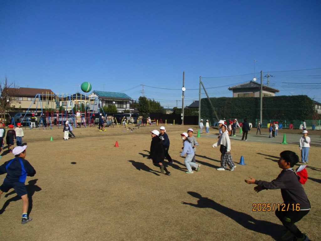 12月16日(火)、年内最後のプレイタイムがありました。天気がよく風もほとんどなかったので、子どもたちの元気な姿がたくさん見られました。6年生が中心となってドッジボールや鬼ごっこ、だるまさんがころんだなどで遊びました。上級生が下級生を助けてあげたり、学年を超えて協力したりするなど、縦割り活動ならではの場面が多々あり、充実した時間となりました。