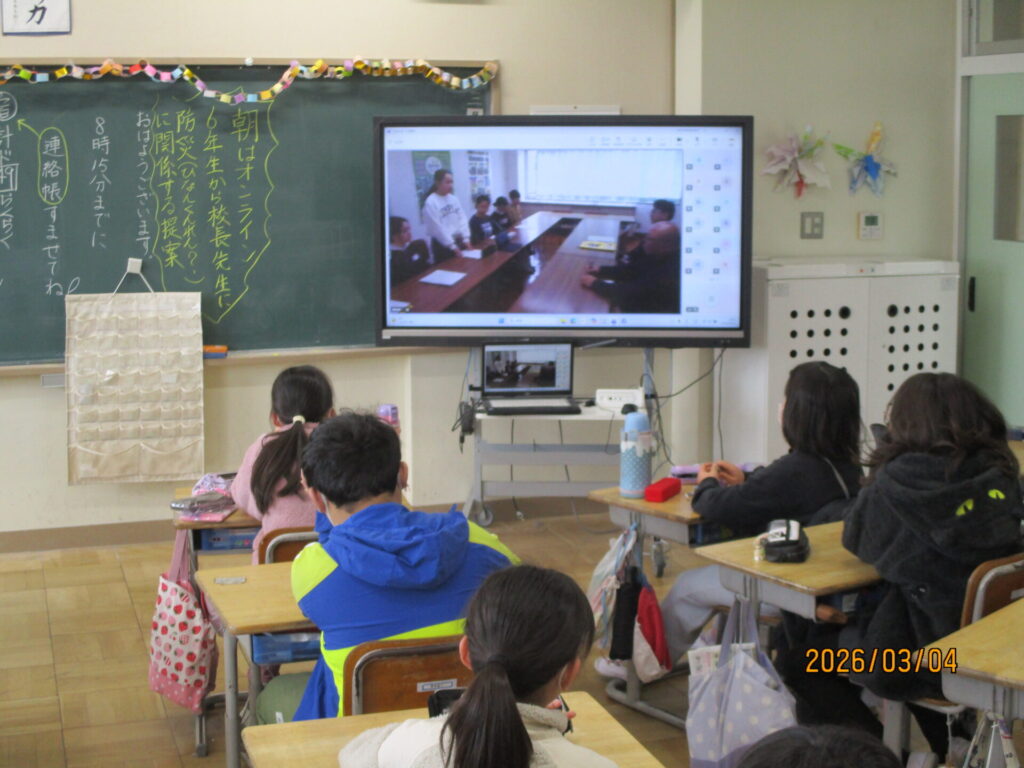 3月4日(水)朝、6年生の代表児童が、総合的な学習の時間に学んだ防災に関連して、「避難訓練」について、校長先生と安全担当の先生に提案を行いました。そして、その様子をオンラインで全校に放送しました。提案内容は、川の氾濫などに備えて3階に避難する訓練や、予告なしの抜き打ち訓練の実施などでした。資料を示しながらの堂々とした提案で、校長先生からの質問にもしっかり答えていました。自分たちにできることを考えて具体的に行動した立派な姿を、どの教室でも「さすが6年生、すごい」という気持ちで見ていました。